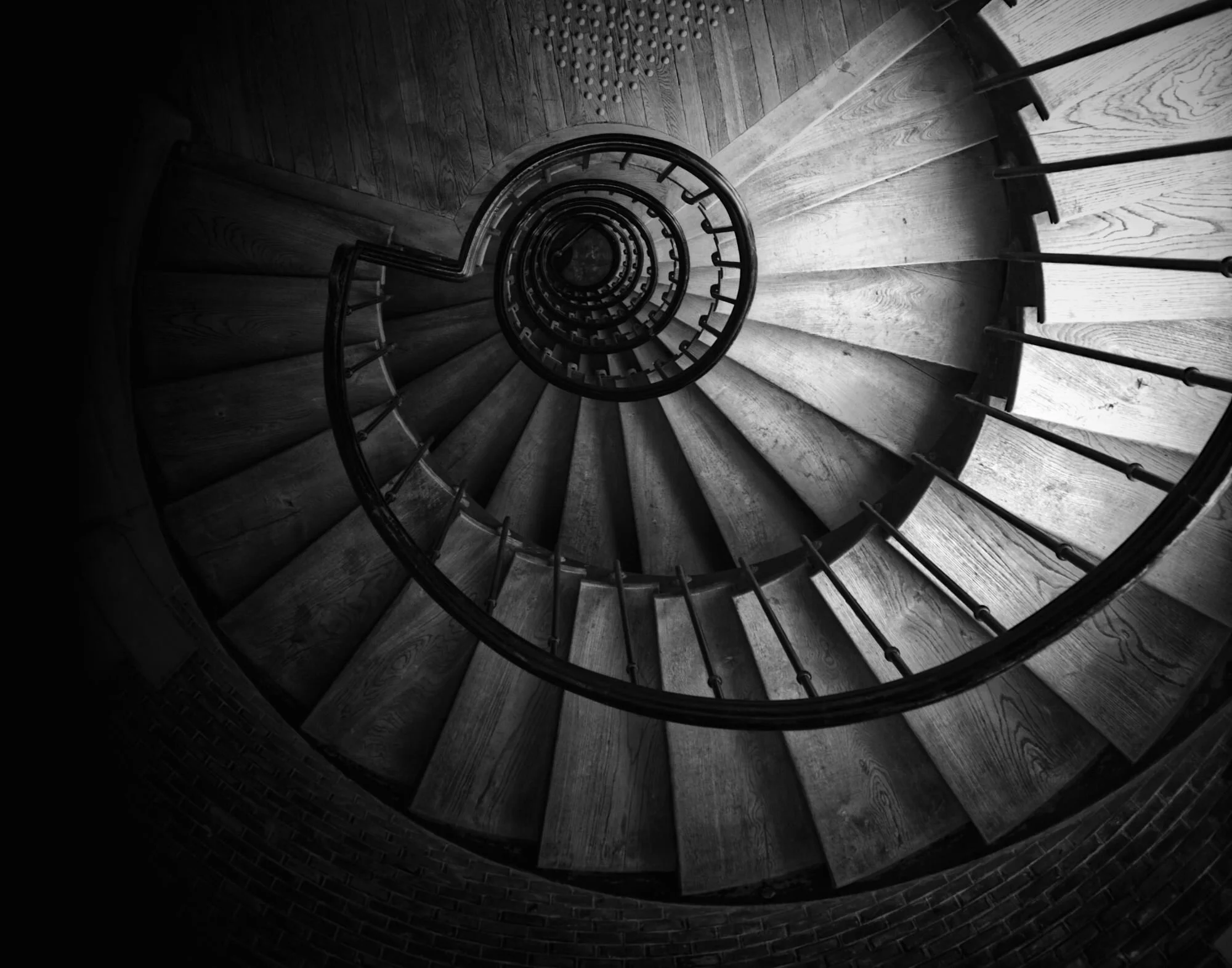 Ces deux photographies proviennent d’un escalier à colimaçon. Leur effet hypnotique et tourbillonnant m’ont curieusement amené, même si l’on y retrouve pas un même plan, à choisir comme intitulé le film Psycho d’Alfred Hitchcock (Psychose en français). Dans une autre référence cinématographique, les étudiants de l’Institut Catholique de Paris comparent souvent cet escalier à celui à colimaçon emprunté par les apprentis sorciers de Poudlard.